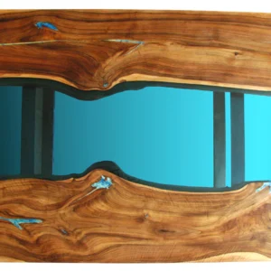 2 869.29 $Double waterfall Live Edge River Coffee Table with glowing turquoise resin. River flows through tale top and then turns to the legs going down. It has a turquoise + emerald resin ‘river’ flowing between wood pieces.