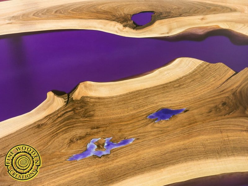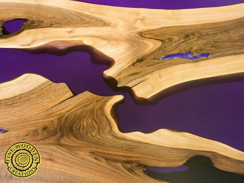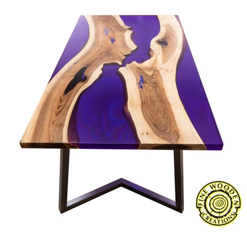 ...Dining table in PURPLE resin color with semi transparent resin made of walnut wood and glowing purple/blue resin. In this example there are some special resin fill in areas which are also mixed with luminescence purple/blue powder. This mix is glowing in the dark – subtle evening color is shining for about 5 hours. Steel brushed legs finished with transparent lacquer. Our furniture will add style and elegance to your interiors.
