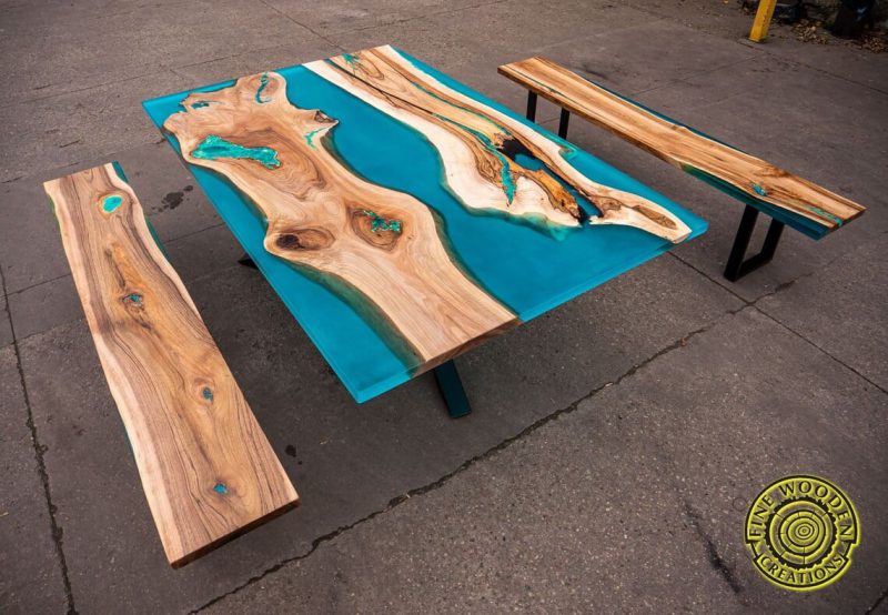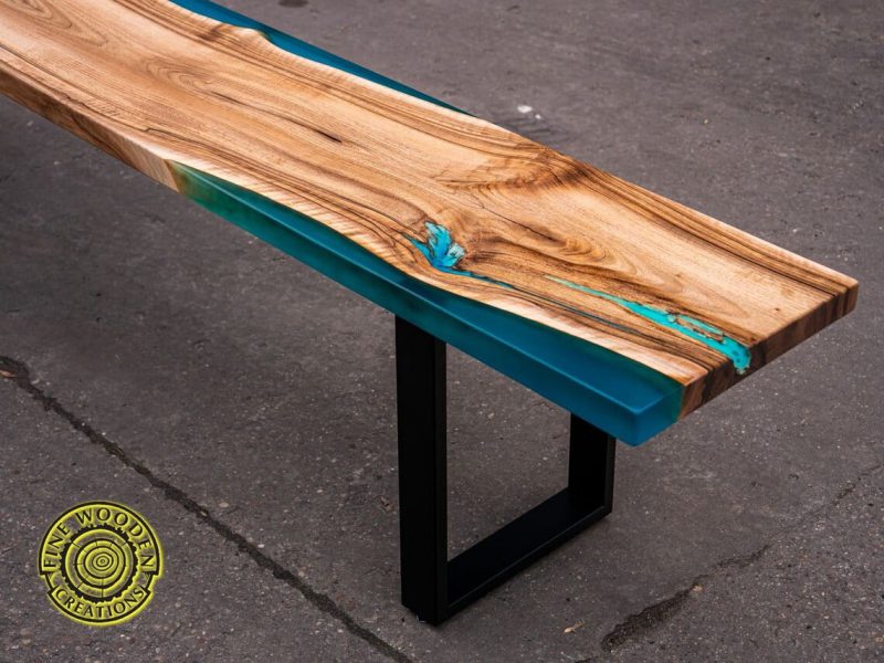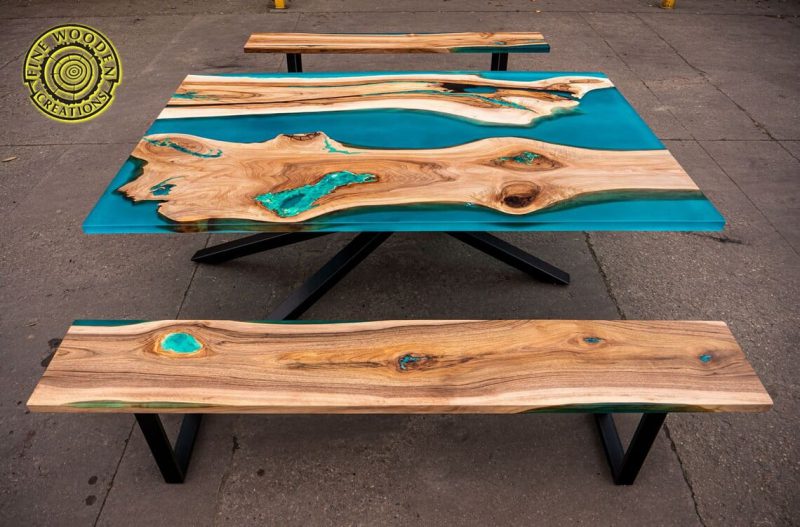 5 729.43 $This is example of modern dining table with bench with glowing turquoise pigment and resin. Table top contains 1 cm thick river blue transparent glass. Turquoise glowing pigment shines for 10 hours after it gets some light – best few minutes of sunlight or strong bulb light.