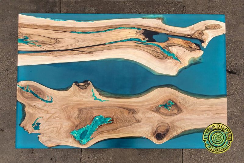 ...Live edge resin river dining table with turquoise glowing resin / elm wood