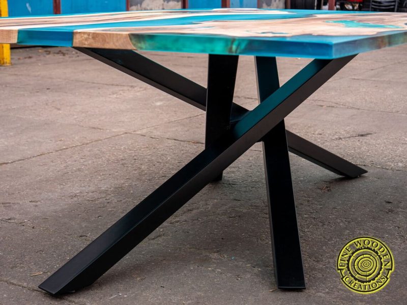 Turquoise glowing pigment shines for 10 hours after it gets some light – best few minutes of sunlight or strong bulb light. Base legs made of stainless steel polished to mirror, attached stabilizing round stands.Resin dining table with glowing inlay and turquoise river