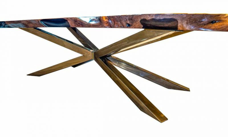 Huge live edge dining table made of guawa exotic wood and gray resin with gold painted legs.