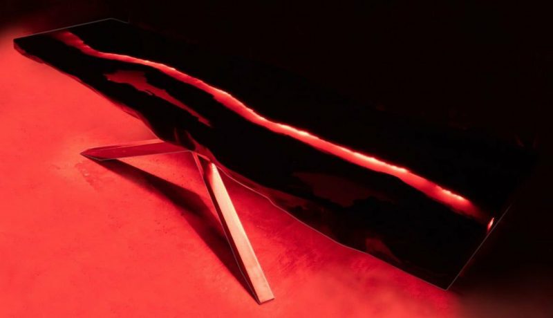 Dining table with red resin river and two benches, semi transparent, black powder coat legs
