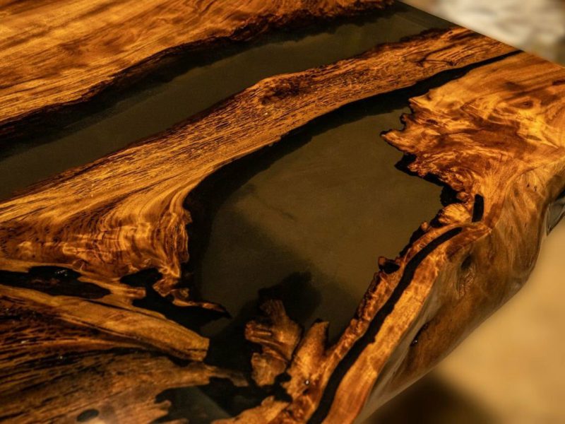 Live edge river glass dining table with bench and glowing resin fill in, steel legs